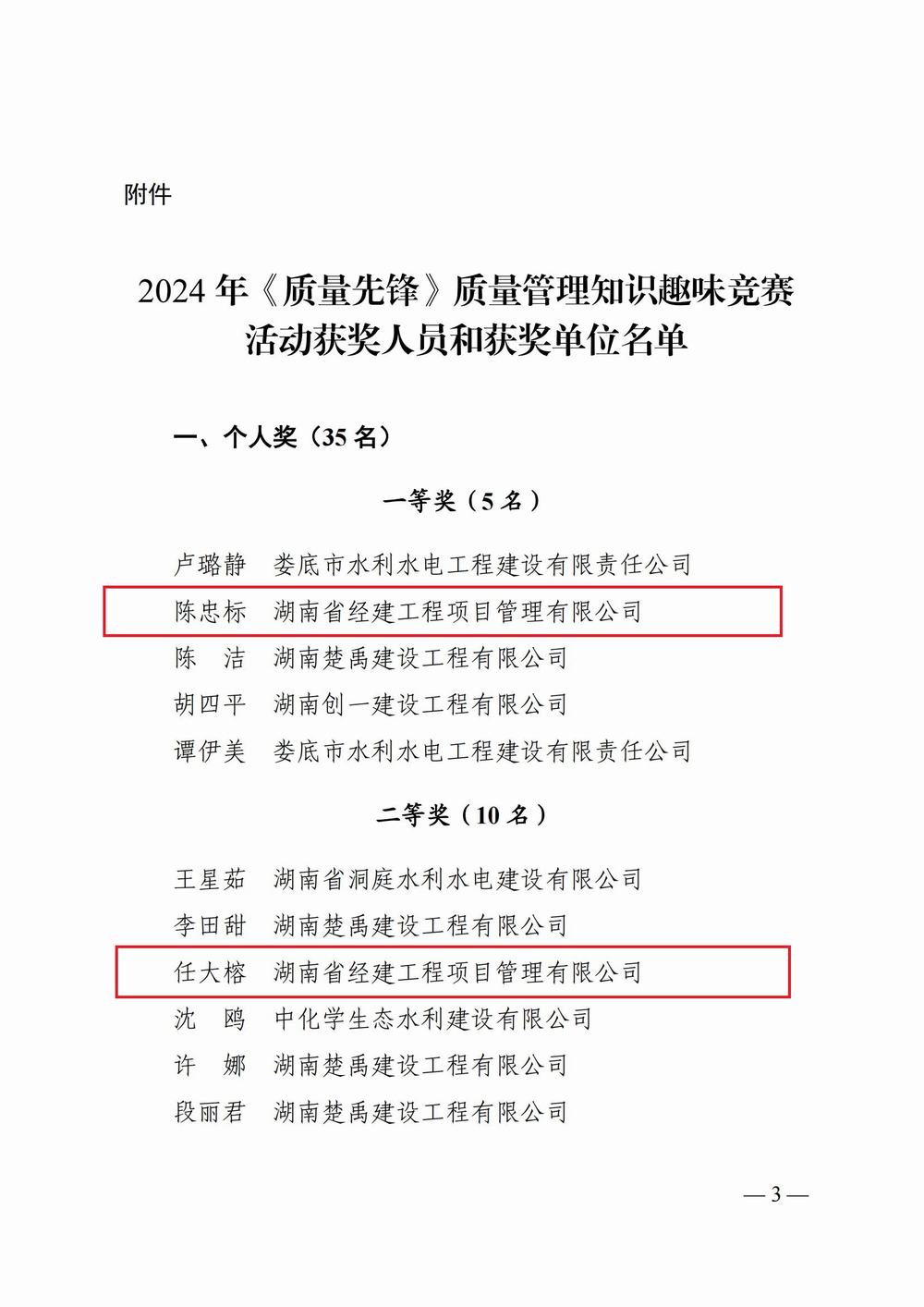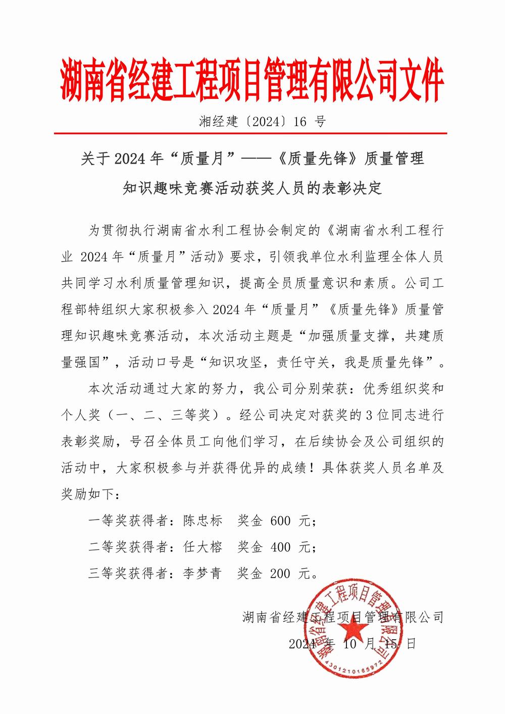 關于2024年“質量月”——《質量先鋒》質量管理知識趣味競賽活動獲獎人員的表彰決定