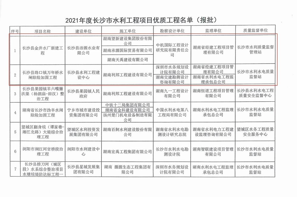 2021年度長沙市水利建設優質工程(金井水廠、萬年橋)
