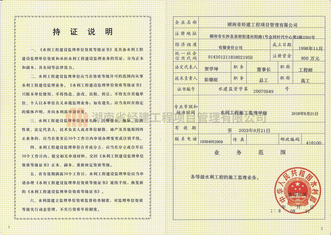水利工程監理資質(正本)